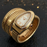 Indulge in timeless elegance with this exquisite gold-tone bracelet watch crafted for refined taste. Featuring a unique oval-shaped dial, radiant crystal-studded bezel, and sleek Roman numeral hour markers, this timepiece blends classic luxury with modern sophistication. The flexible gold bracelet offers a seamless fit and unmatched comfort, making it a statement accessory for special occasions, evening wear, and premium gifting.